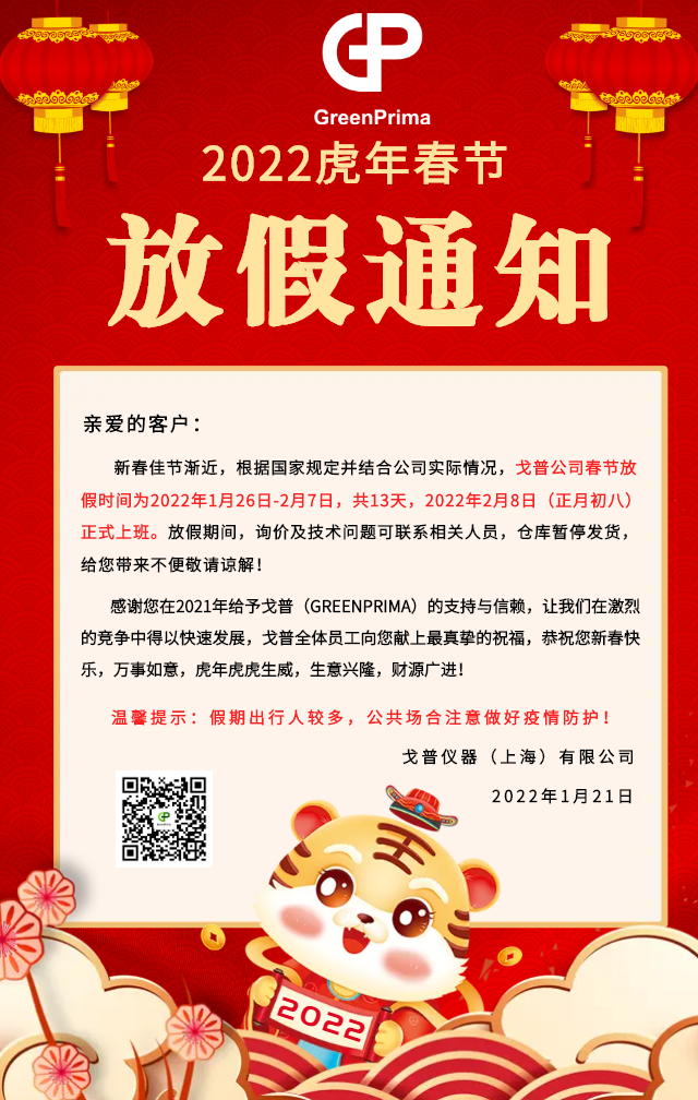 歡歡喜喜迎虎年!戈普公司春節放假時間為2022年1月26日-2月7日,共13天,放假期間,有詢價或技術問題請撥打相關人員移動電話,倉庫暫停發貨,給您帶...